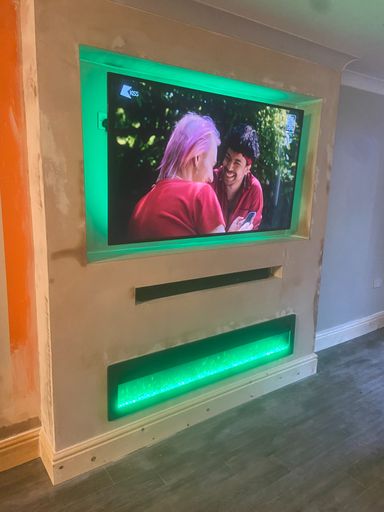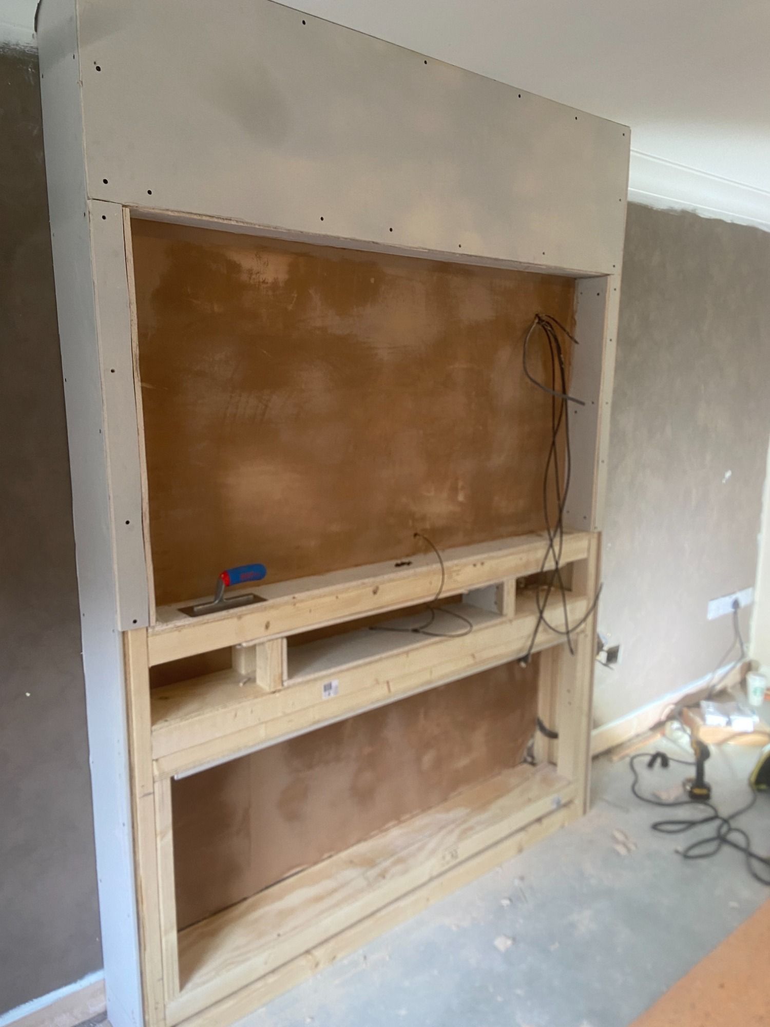 Most new build houses have no features in the living room so you are basically sat in a box trying to find a unit for your tv to sit on. Well we can offer an alternative solution by adding a chimney breast with inbuilt tv and electric fire that will bring your room alive